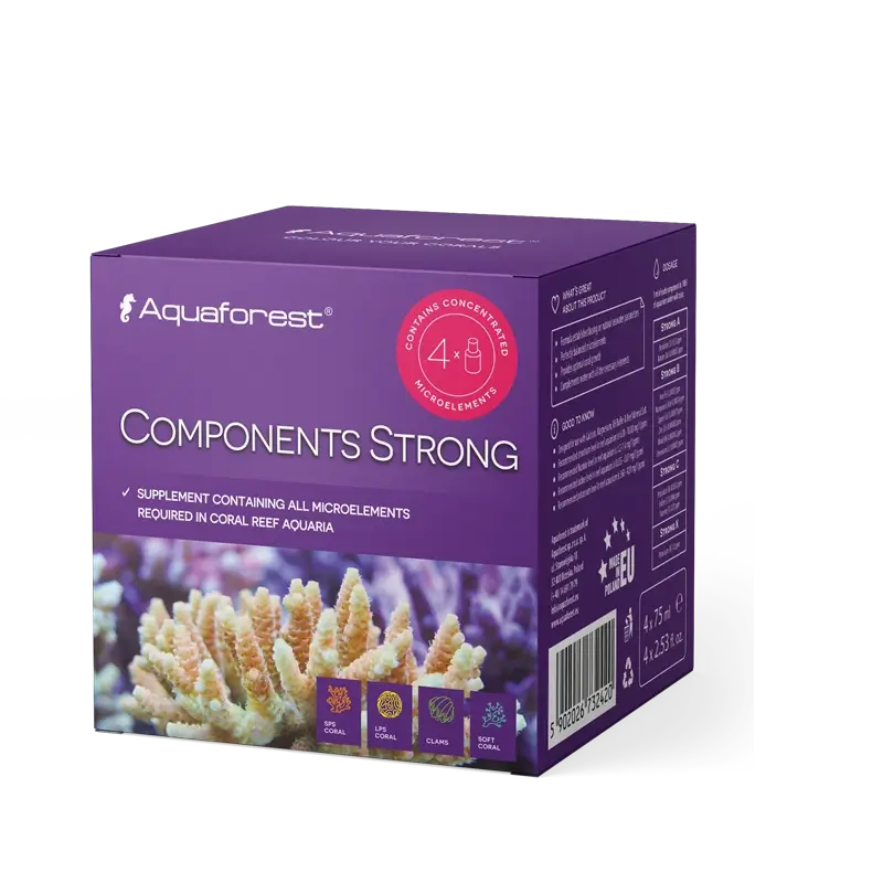 Componentes Strong são acessórios para o bailling básico da AquaForest que contêm microelementos concentrados. Deve ser usado junto com o KH, Calcium, Magnesium e Reef Mineral Salt da Aquaforest. O número de micro-elementos administrados depende da demanda de magnésio e cálcio.