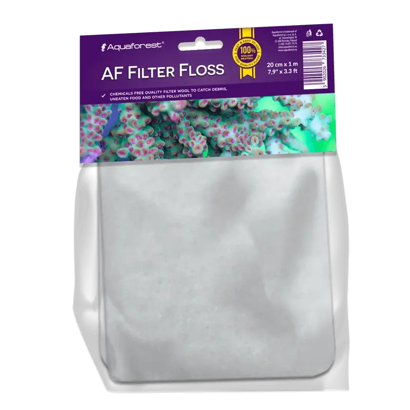 AF Filter Floss remove eficazmente a contaminação visível da água. O tecido não denso e compacto captura facilmente todas as impurezas, como detritos, resíduos de alimentos não consumidos ou fezes. Tudo o que foi mencionado pode resultar na dificuldade de remoção de poeira na profundidade da água. AF Filter Floss é um remédio perfeito para resolver esses problemas. A poluição visível da água afeta não apenas a estética do tanque, mas também a sua saúde geral. Muitos detritos acumulam níveis de compostos como nitrato, amónia e fosfato. O uso do AF Filter Floss permitirá maior controle sobre esses parâmetros.