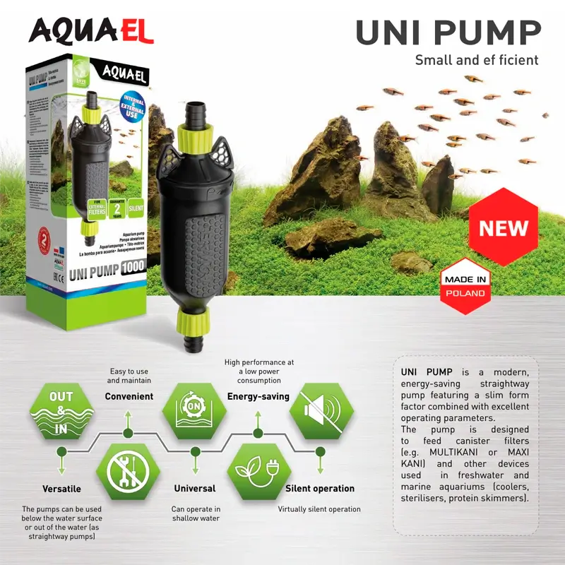 A gama AquaEL Uni Pump define a nova norma de eficiência no suporte técnico ao aquário, oferecendo uma versatilidade inigualável tanto em sistemas de água doce como salgada. Construída para operar dentro ou fora de água, a AquaEL Uni Pump é a solução ideal para quem procura mover água com precisão sem ocupar o espaço precioso do tanque principal. O design inteligente da AquaEL Uni Pump permite a sua instalação direta entre duas secções de mangueira, facilitando a integração em circuitos de filtragem complexos ou sistemas auxiliares.