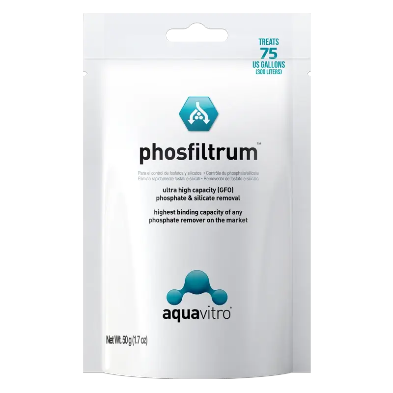 O phosfiltrum é um óxido férrico granulado (GFO) especialmente formulado e de alta densidade. phosfiltrum ™ removerá rapidamente fosfatos e silicatos de água doce e salgada e não os libertará de volta para o aquário. É muito mais rijo que outros GFOs, então não vai se quebrar em partículas finas no seu aquário. Tem maior capacidade de ligação de qualquer outro removedor de fosfatos, por isso dura muito mais antes de precisar ser substituído. A cor castanho escuro distinta identifica o phosfiltrum ™ como o principal produto do setor.