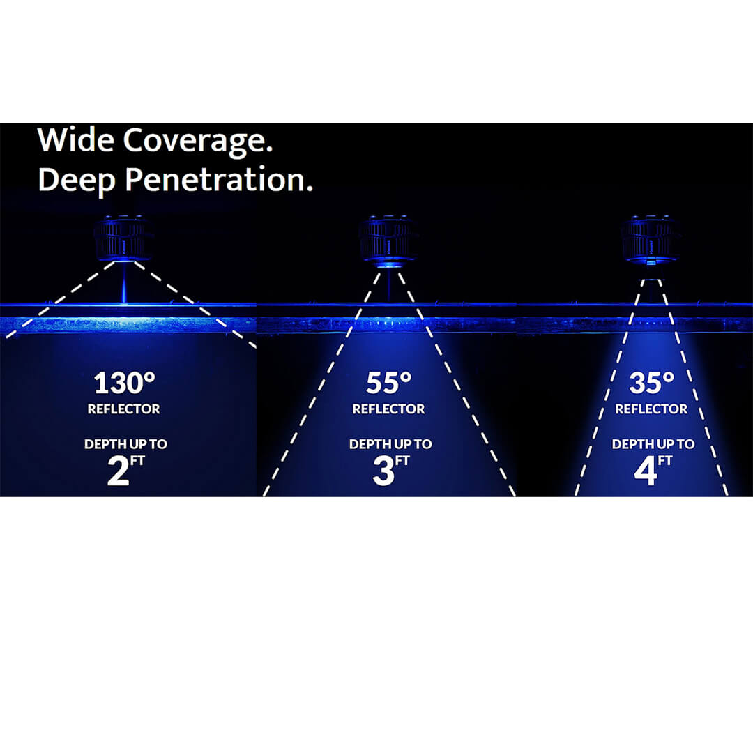 Kessil Focos LED A160 de 40W Tuna Blue para aquários marinhos têm a tecnologia patenteada de LEDs Dense Matrix que concentra múltiplos chips de LED numa única matriz, criando uma fonte de luz poderosa e penetrante com ampla cobertura. A penetração pode ser mais profunda da padrão ao diminuir a distância entre várias unidades de LEDS Kessil.