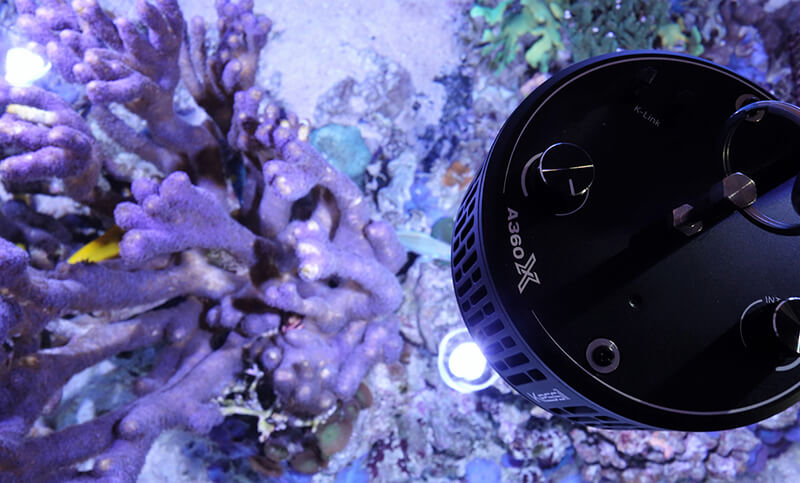 O compacto Kessil® A360X Tuna Blue LED com alta emissão de luz e tecnologia de comunicação inteligente K-Link permite diversas opções de controle de cores. Combinações ilimitadas de cores, transições suaves de cores, além de experiências estéticas de iluminação, efeitos de escurecimento e simulação da luz natural da lua. O espectro promove o crescimento e a coloração dos corais.