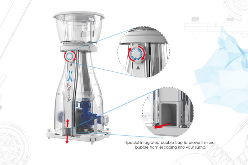 O Escumador Aeraqua Duo está equipado com uma bomba Maxspect Turbine Duo com duas entradas e duas saídas. A bomba é praticamente imperceptível porque usa tecnologia de onda sinusoidal. O seu silenciador de ar integrado no painel inferior do escumador está submerso e a água ajuda a abafar qualquer som produzido no interior. Uma inovação Maxspect.