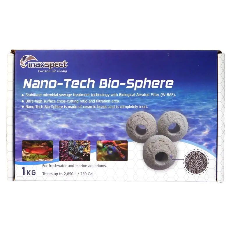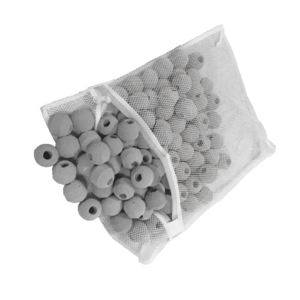Maxspect Bio Sphere é um material altamente poroso à base de micro-esferas cerâmicas inertes, cada esfera equivale a 1 kg de rocha viva. Inclui rede para colocação em sump ou filtro.