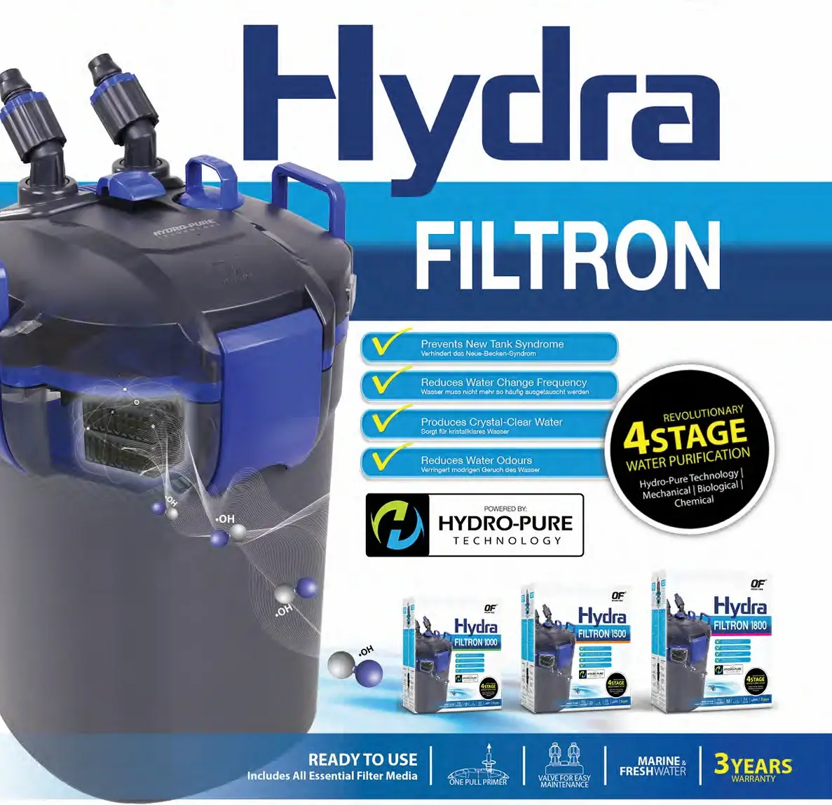 A Purificação de Água em 4 Estágios da Hydra Filtron vai além da filtração convencional de 3 estágios (Mecânica, Biológica, Química), com a incorporação da revolucionária tecnologia Hydro-Pure. Esta tecnologia utiliza Radicais Hidroxílicos (•OH) para acelerar o tempo de inicialização das 4 etapas habituais de 5 semanas para apenas 1 semana, reduz o odor da água e mantém o aquário cristalino. É o primeiro filtro externo no mundo a incorporar a tecnologia Hydro-Pure no seu design.