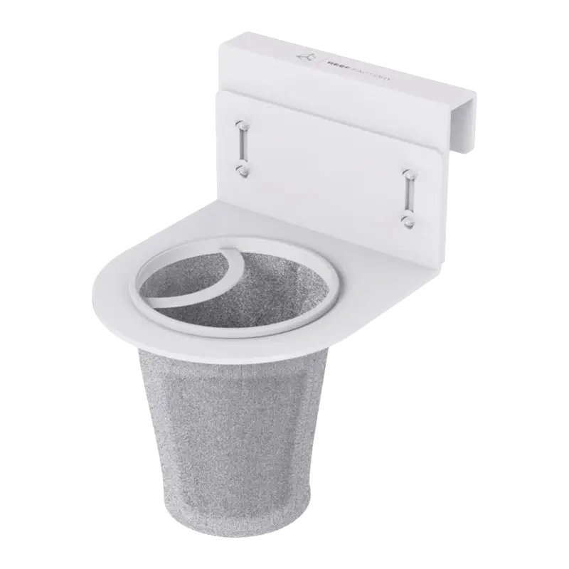 Filtragem para tubo de descarga na sump. Reef Factory Filter sock Mounting kit rubosto  com diâmetro de 100 mm e meia Reef Factory Filter sock ⌀100 mm/150 microns. Mounting kit  de duas partes adaptável às tuas preferências com acessórios para aparafusar incluídos.