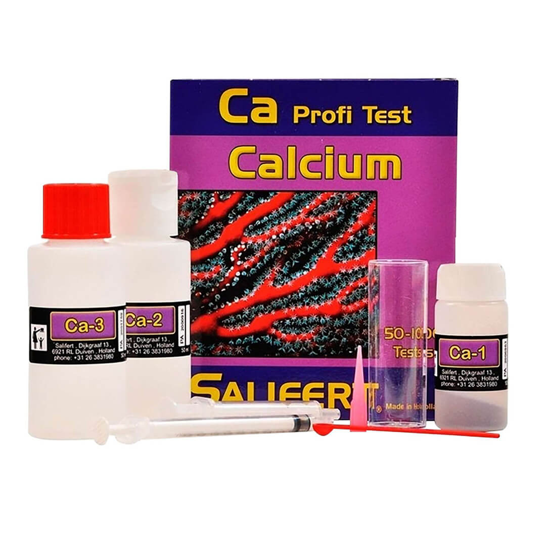 Salifert Teste de Cálcio mede a concentração de cálcio em aquários de recife. É um dos testes fundamentais, a par do Teste de KH do hobby. Isto porque o cálcio é um constituinte do esqueleto dos corais duros e das linhas esqueléticas dos corais moles. O cálcio é utilizado por corais e com o tempo tem tendência a cair, mas uma concentração elevada também stressa os corais. Devemos manter entre 400-450 mg/L e as flutuações não devem ser superiores a 15 mg/L.