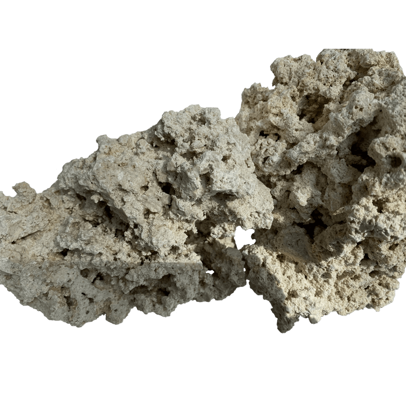 Este tipo de rocha seca é 100% natural e é composta apenas por carbonato de cálcio (aragonita). Pode ser usado com segurança em aquários marinhos e de recife, bem como em aquários de água doce que requerem água dura (ciclídeos).
